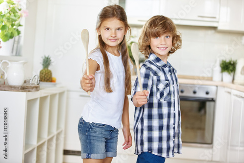 Zwei Kinder spielen mit Holzlöffeln in der Küche