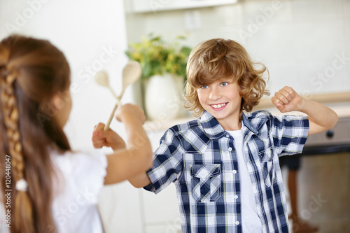Junge und Mädchen kämpfen fröhlich mit Kochlöffeln
