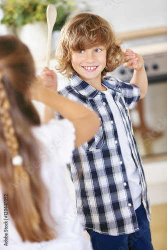 Junge und Mädchen kämpfen fröhlich mit Kochlöffeln