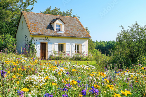 Charming rustic English farmhouse surrounded by wildflowers on a sunny day