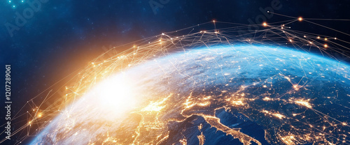 Global Network of Data Connections Arcing Over Illuminated Earth at Night.