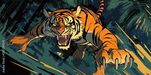 Fierce tiger leaping dynamically in comic-style artistic illustration