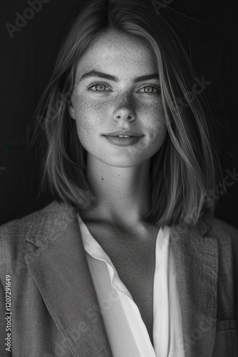 Black and white portrait of a confident Swiss woman in striking elegance