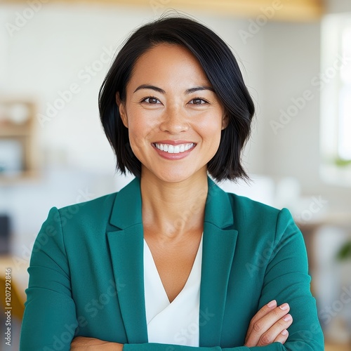 Confident young Asian businesswoman smiling in modern office setting