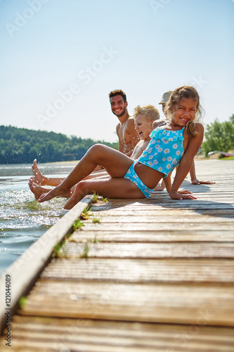 Glückliche Familie kühlt Füße im See