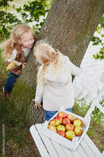 Kinder spielen im Herbst bei Apfelernte