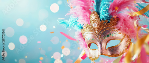 Colorful carnival mask with feathers and confetti on a festive blurred background