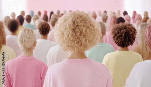 Group of women with unique hairstyles in colorful pastel clothing from behind