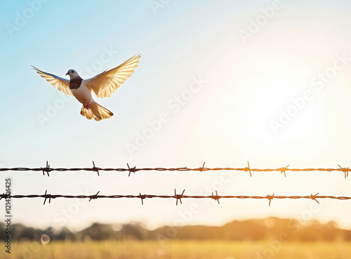 Doves on a barbed wire fence in a serene natural setting at sunset