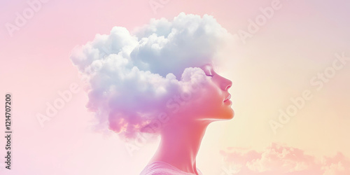 Woman's profile with hair resembling clouds in a dreamy pastel background