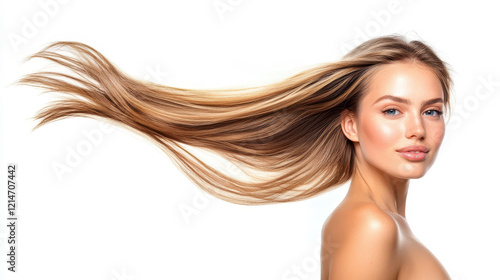 Beautiful woman with radiant, healthy long hair in motion, showcasing vitality and elegance against a simple background