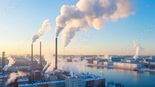Industrial cityscape with smoke emissions under a serene colorful sky