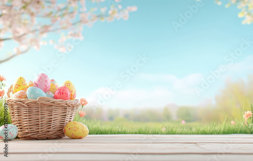 Easter eggs in basket on wooden table in sunny garden setting
