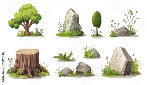 Collection of natural landscape elements including rocks, stumps, and grass