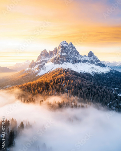 Majestic winter sunrise in the snowy Dolomites with forests and mist