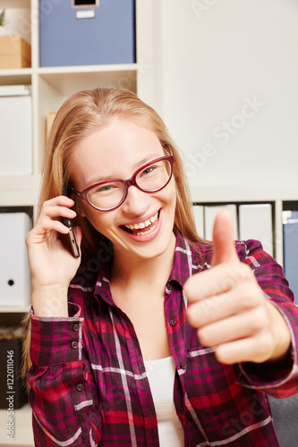 Lachende Frau zu Weihnachten hält Daumen hoch