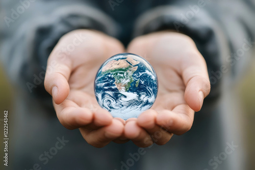 Hand holding green grassy Earth globe symbolizing environmental awareness and sustainability