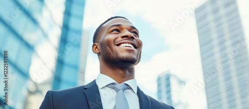 Smiling businessman standing confidently against a backdrop of modern skyscrapers
