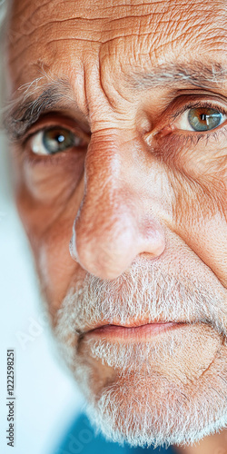 Close-up portrait of an Australian senior man with white beard and blue eyes