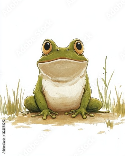 Cute cartoon frog with big eyes sitting on white background, inspired by children's animations
