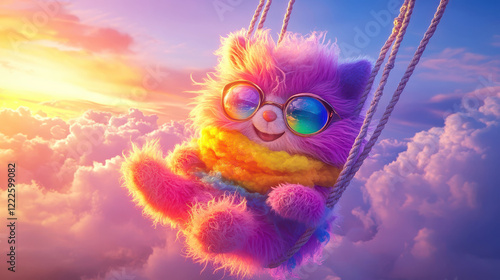 Whimsical fuzzy creature swinging against a vibrant sunset over the clouds