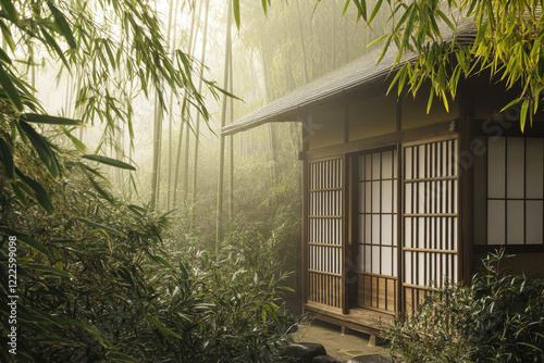 Traditional Japanese tea house surrounded by serene bamboo forest