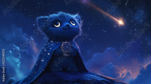 Whimsical blue creature in a starry night sky gazing at shooting star