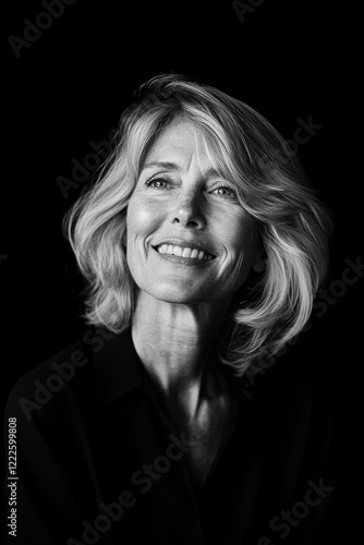 Black-and-white portrait of a happy Norwegian woman with a genuine smile