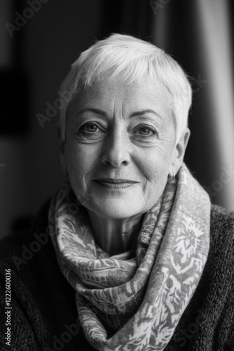 Portrait of a smiling silver-haired senior woman in a navy blazer, exuding confidence and elegance.
