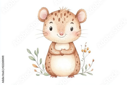 Smiling cartoon quoll illustration with botanical accents for children’s decor