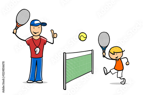 Kind mit Trainer oder Sportlehrer beim Tennis Training