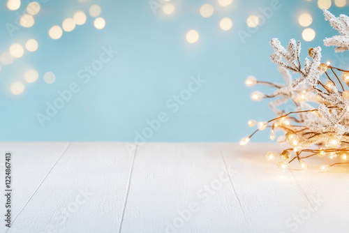 Wooden table in a cozy cafe with warm bokeh lights and festive blurred background