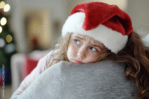 Sad girl wearing Christmas hat hugging her mother during holidays