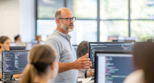 Engineer teaching programming to students in a modern classroom setting
