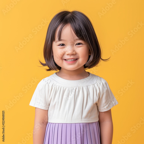 Smiling Asian girl, bob haircut, wearing a purple skirt on yellow background