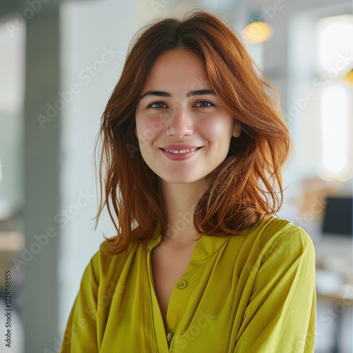 Smiling middle-aged woman in teal blouse with wavy red hair