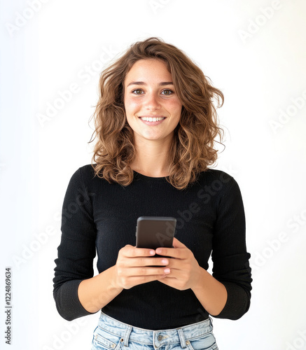 Young woman smiling brightly while using a smartphone