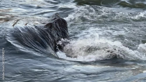 Rapid River Water Flows Around a Dark Rock, Creating Whitewater and Foam, in slow-motion