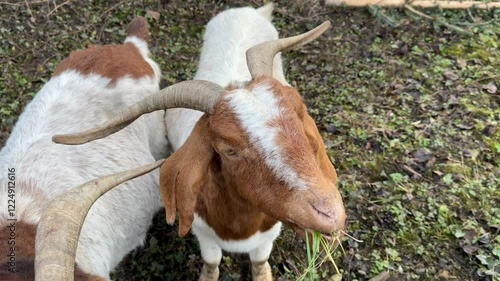 Goats with Horns Eating Grass in a Field, Looking at the Camera, in Slow-Motion.