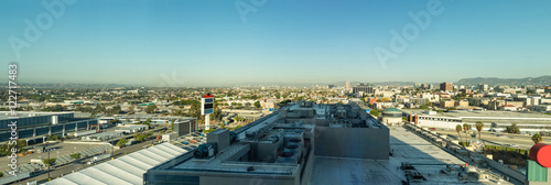 Aerial view of drone flying above a construction site in a bustling cityscape