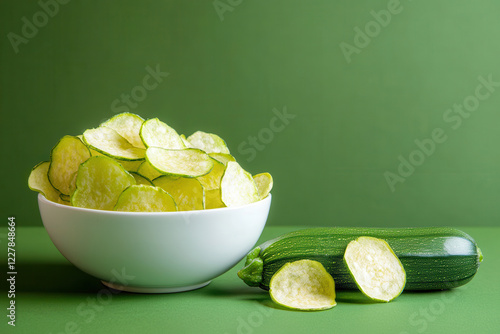 Fresh zucchini with a bowl of healthy green vegetable chips displayed