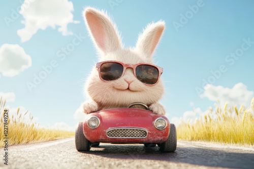 White rabbit driving a toy car wearing sunglasses on a sunny countryside road