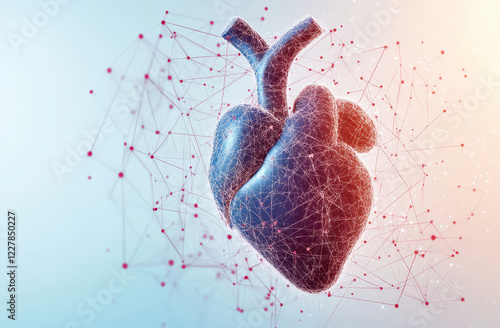 Detailed 3D rendering of a heart surrounded by a data visualization network