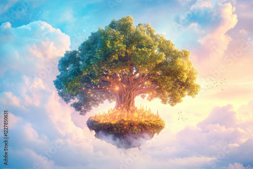 A majestic tree floating among clouds in a serene, dreamlike setting