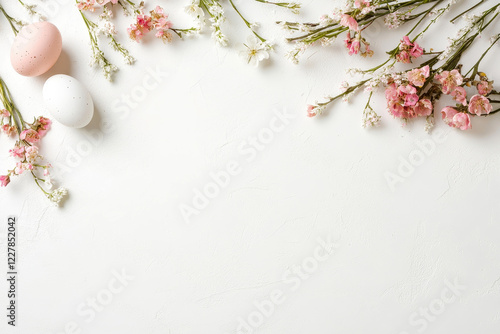 Easter frame with pastel eggs and pink spring flowers on a white background