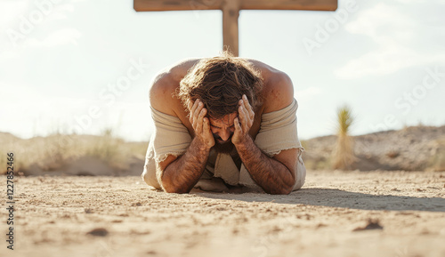 Man kneeling in prayer under heavenly light in a serene outdoor setting