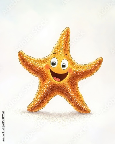 Delightful cartoon starfish illustration in a playful children's style with smiling face and ocean background elements.