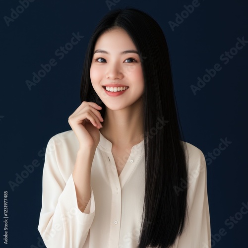 Joyful Asian woman in blue dress with flowing black hair