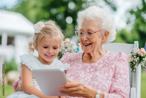 Elderly woman and young girl enjoying a tablet outdoors on a sunny day