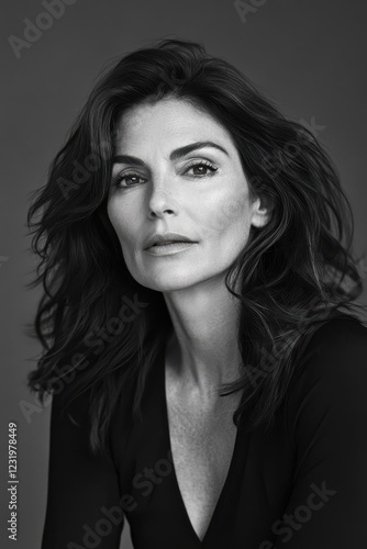 Black-and-white portrait of an Australian woman with a braid and a calm expression